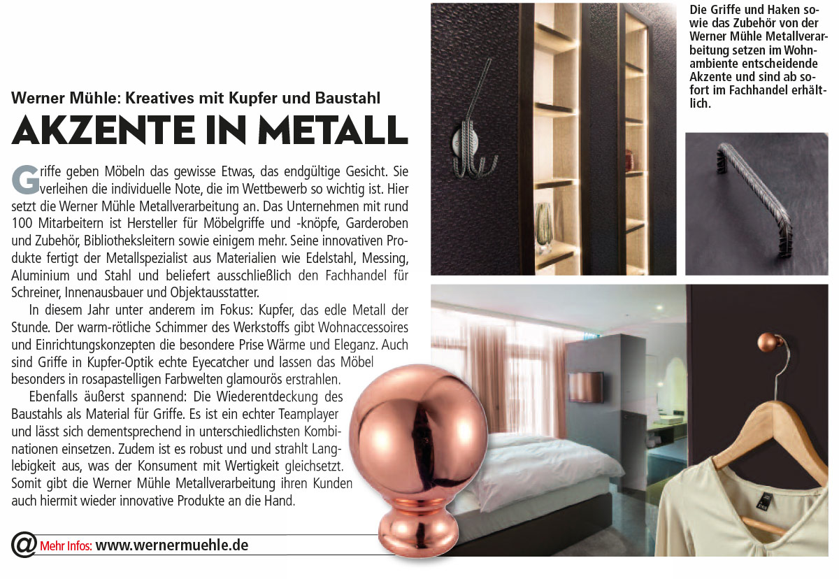 Werner Mühle Metallverarbeitung hat nun eine neue Produktserie in kupferfarbender Oberfläche entwickelt. Möbelgriffe, Möbelknöpfe und Garderobenhaken in Kupfer Oberfläche passen perfekt zu hochglänzenden, weißen, schwarzen Möbelfronten oder auch zum aktuellen Landhausstil und werden zum Blickfang eines jeden Möbelstückes.